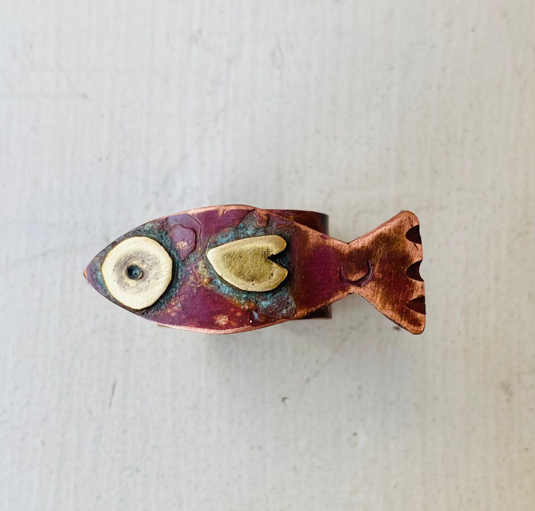 This adjustable fish statement ring is crafted in copper and brass, with a textured surface that catches the light beautifully and feels alive in the hand.