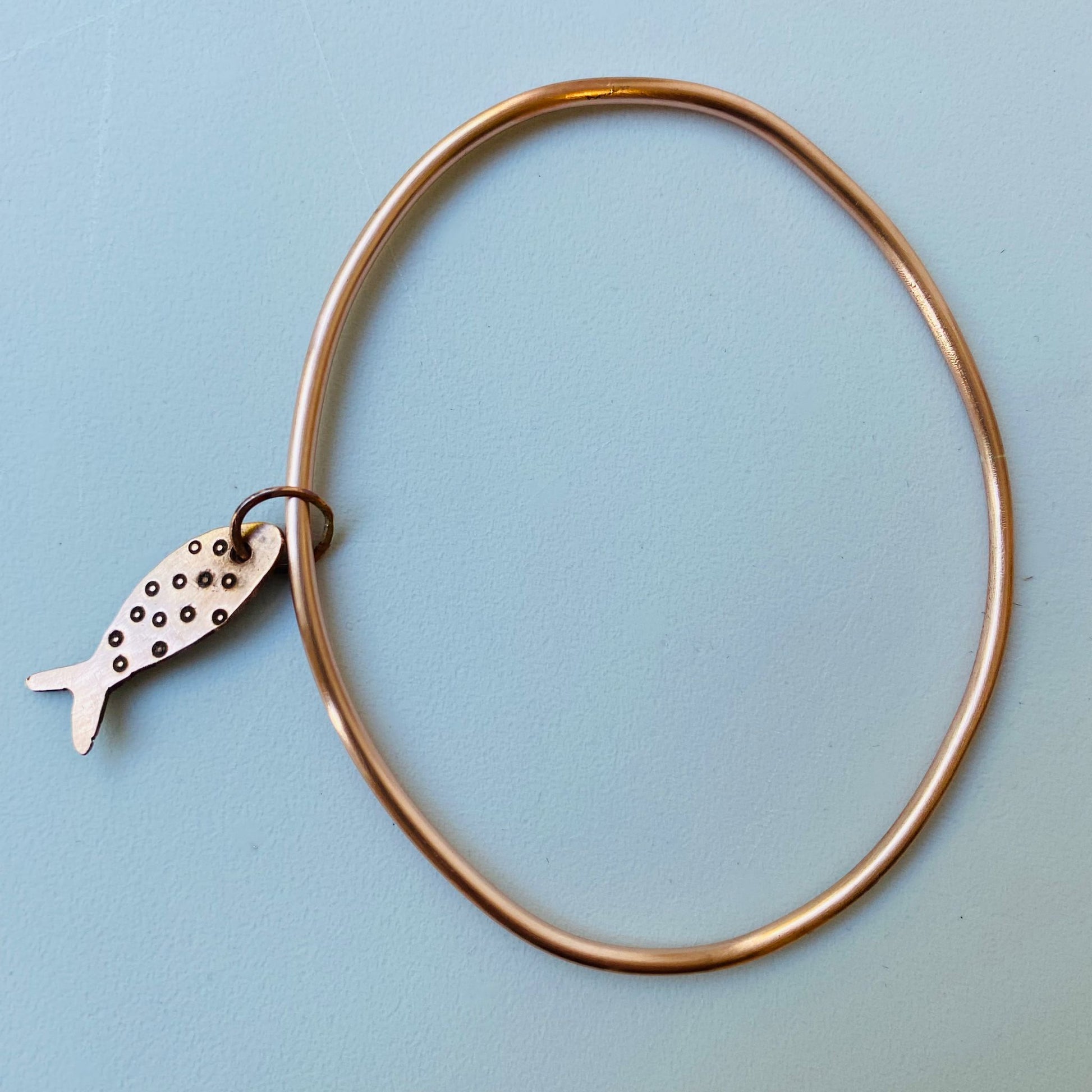 A beautiful solid copper bangle partnered with a lovely dangly fish charm, hand-cut out of copper, decorated with stamping.