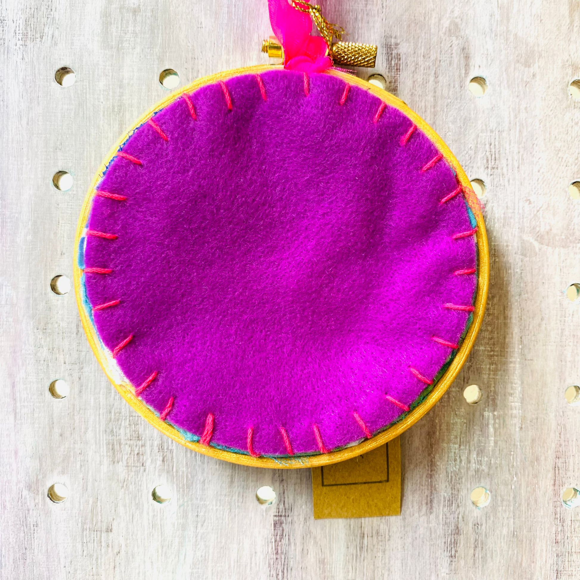 One of my medium sized hoops in gold, this piece of embroidery is filled with colour and wonderful textures. Backed with hand-stitched felt in a contrasting colour.