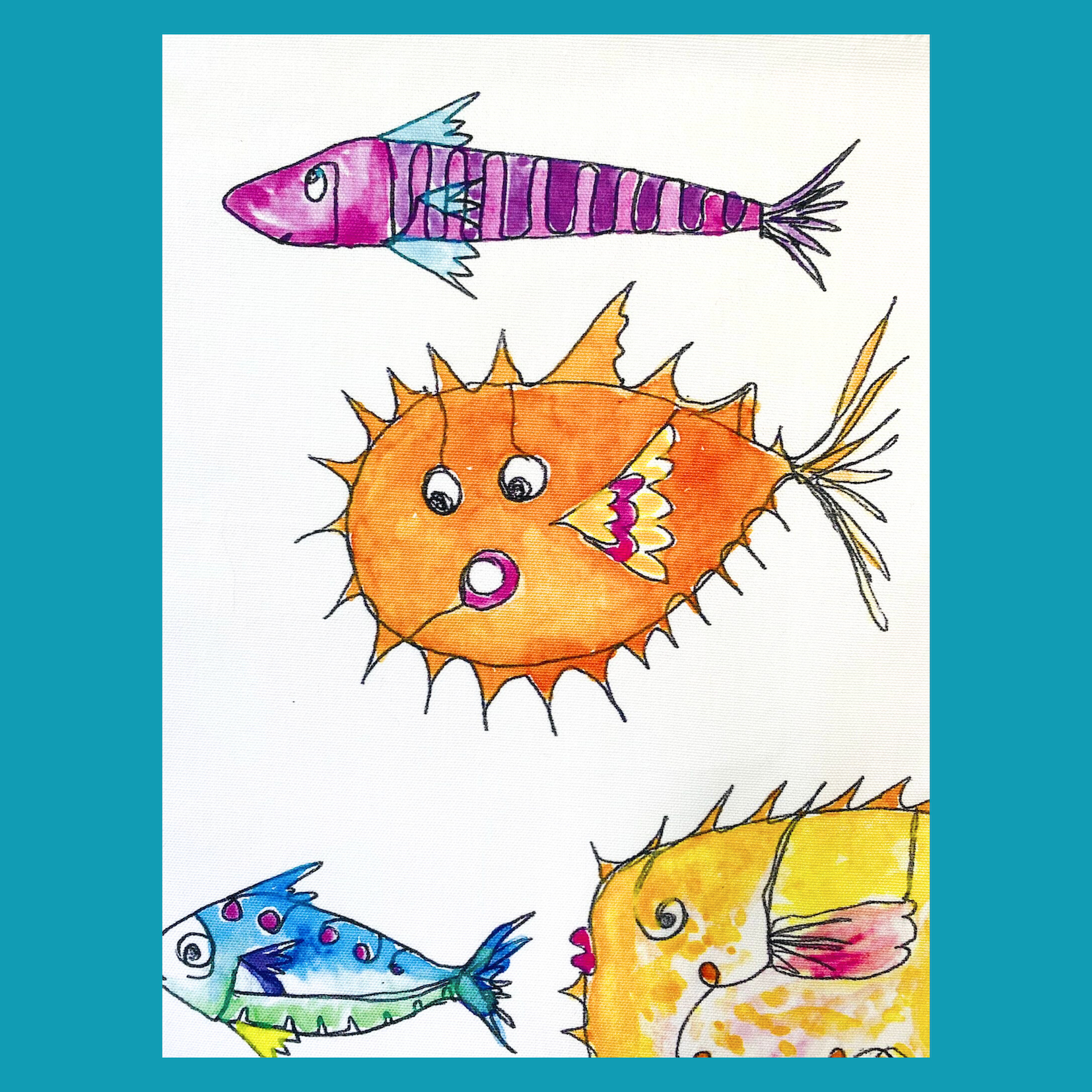 Continuing on my theme of nature in the design of my Tea-Towels, notebooks cards and prints, this wonderful and whimsical continual line drawing of my version of fish was made in 2023.