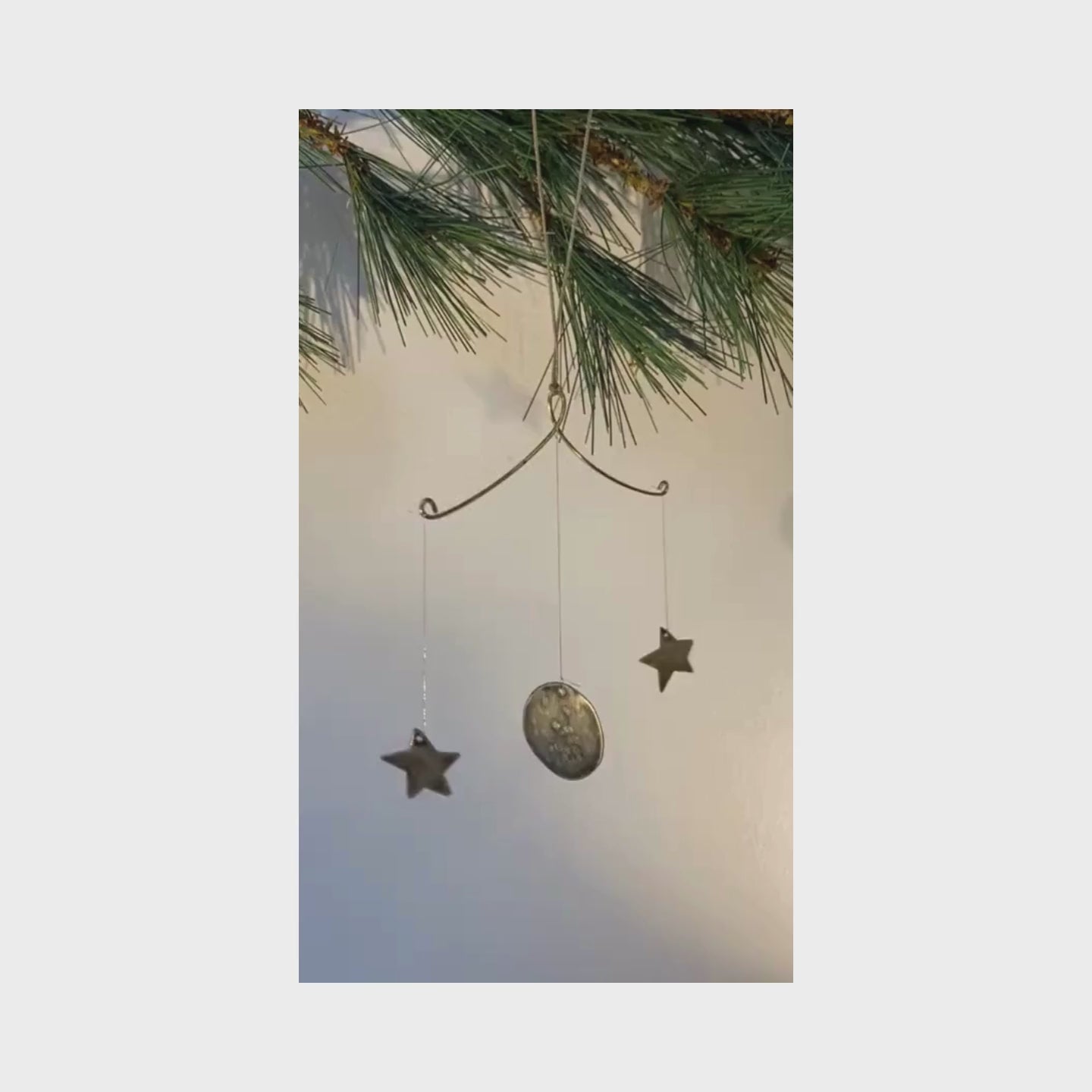 This Nickel Silver Full Moon and two Stars mobile is a one-of-a-kind piece of art, featuring a harmonious blend of warm and cool metallic tones that shimmer in natural light. Designed for dreamers, stargazers, and lovers of handcrafted decor, these mobiles are perfect as a statement piece or a thoughtful gift for any occasion.
