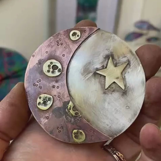 This beautiful New Moon and Star Brooch is made by hand in my St Austell workshop. The base is cut from nickel silver, forming a pale sky. A copper new moon sits across the surface, detailed with stamped brass craters. A single brass star adds a simple focal point.