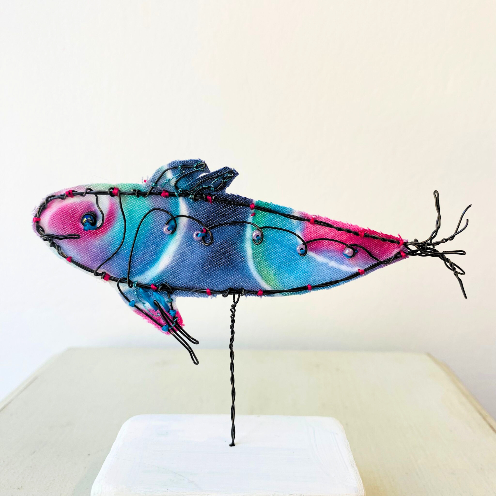 This Sardine Sculpture is combined with lovely bespoke Batik fabric in bold colours, embellished with contrasting embroidery and beads.