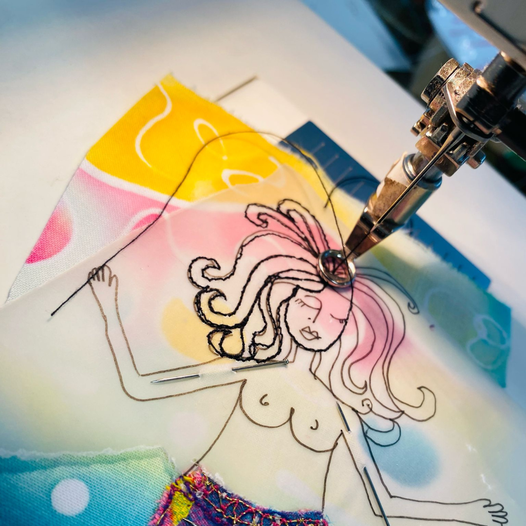 This mixed-media piece brings together several threads of my practice. A hand-embroidered mermaid sits quietly on a batik fabric background, its soft sea-washed colours echoing the coastline here in Cornwall.