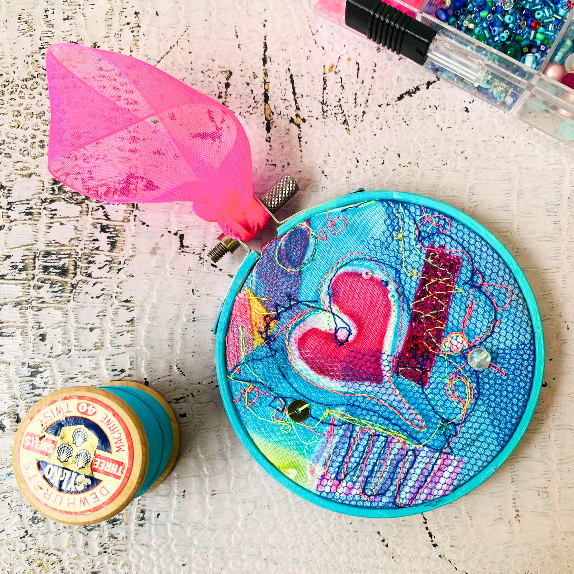 Created using my handmade Batik fabric - with a Heart motif layered with tulle, fabric scraps and ribbons embroidered together by hand and machine stitches, with beads and sequins added to really help them to pop!